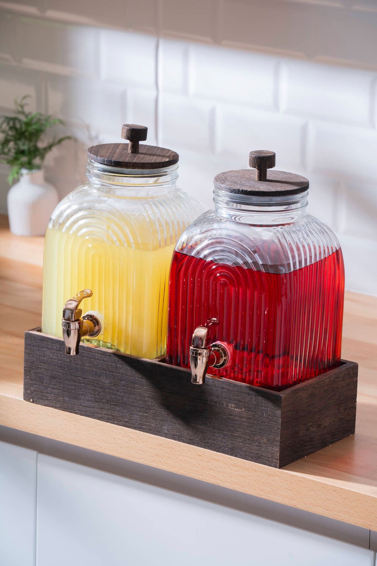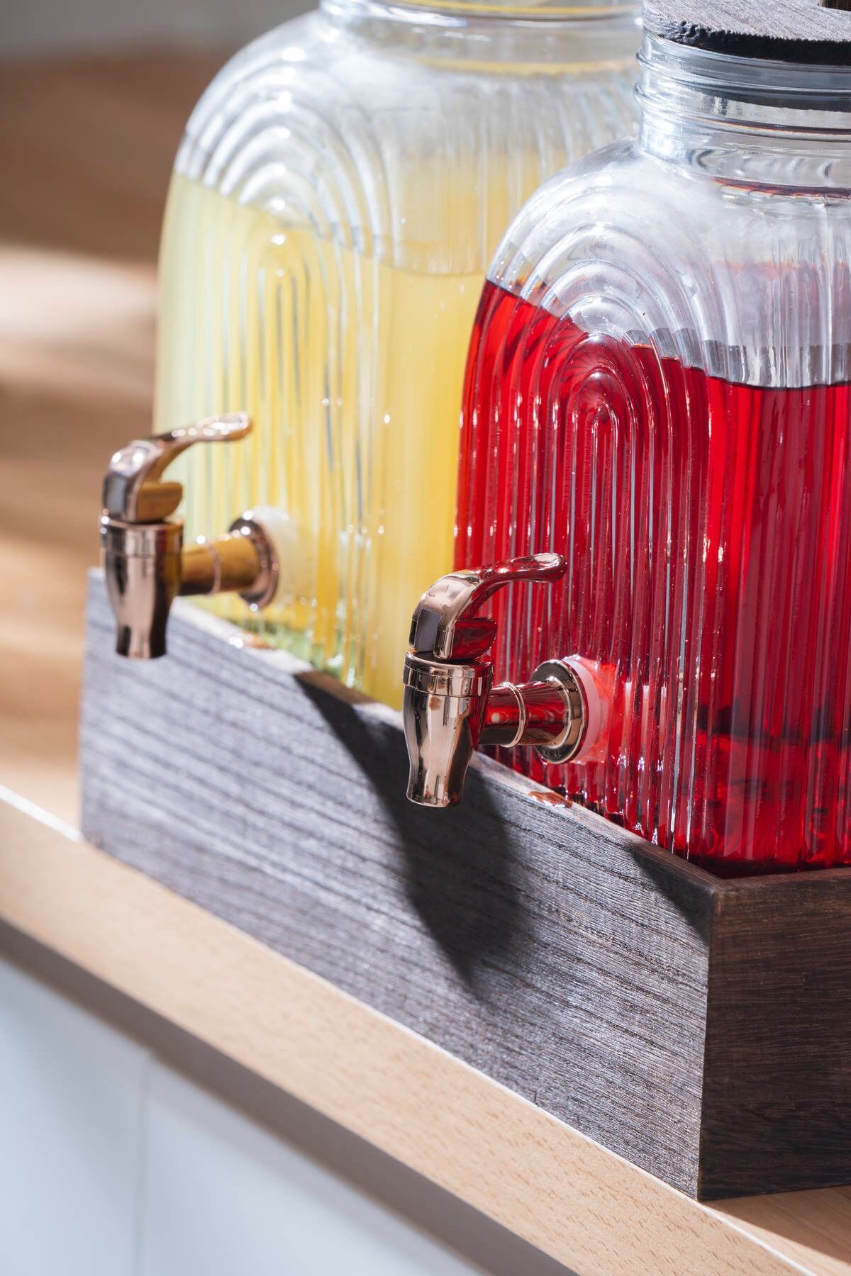 Dominic cam sebil seti, yaz-kış sofralarınıza şıklık ve fonksiyon kazandırıyor. 3 litrelik iki ayrı cam haznesi ile limonata, soğuk çay, aromalı su gibi farklı içecekleri aynı anda servis etme kolaylığı sunar. Sağlam ahşap standı mutfağınıza rustik bir dokunuş katarken, damlatmaz musluklarıyla da pratik kullanım sağlar.