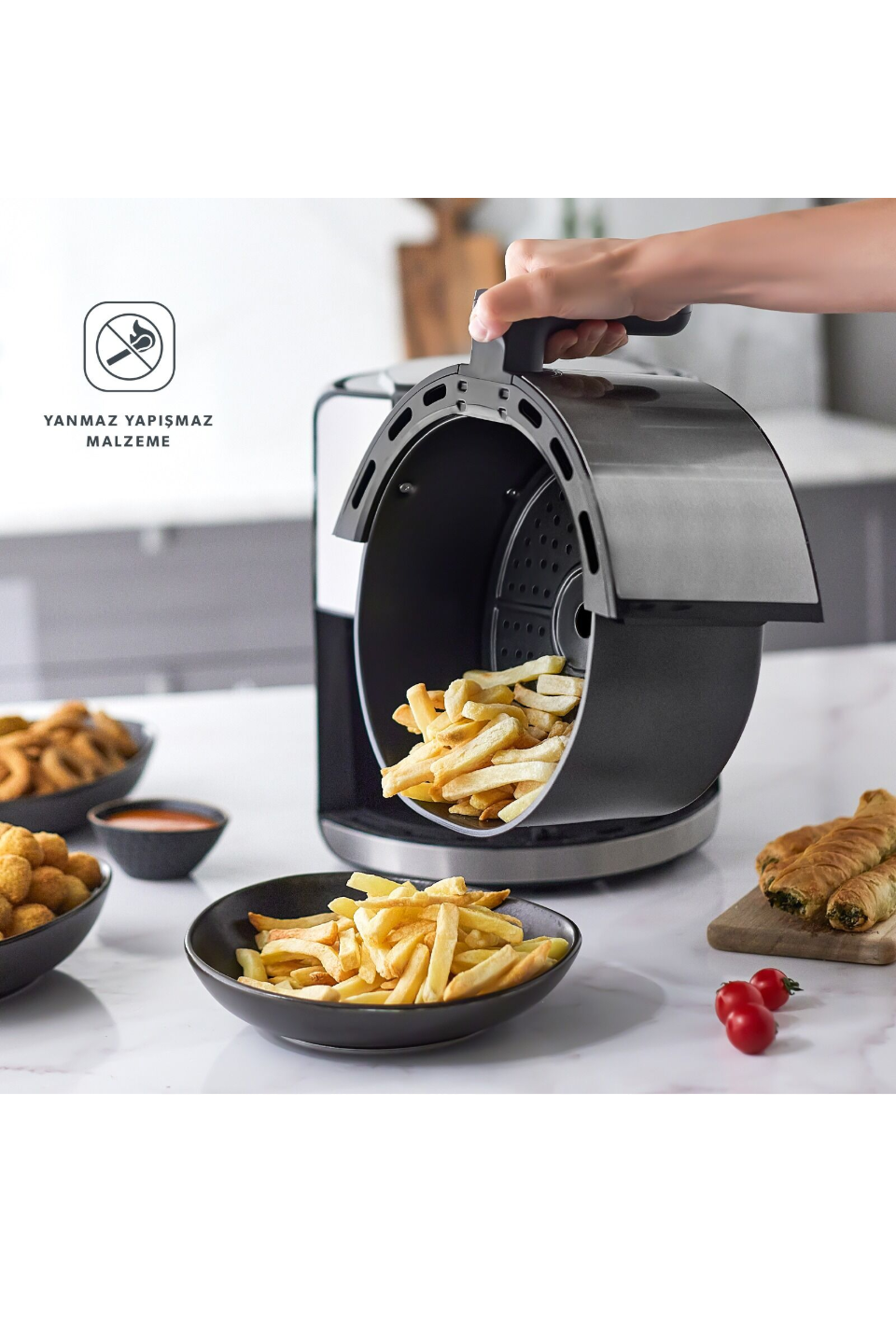 Sıcak havayla çalıştığı için geleneksel kızartma yöntemlerine oranla %85 daha az yağ kullanır. 360° hızlı ısı teknolojisiyle yiyeceklerinizi, yağ çektirmeden çıtır çıtır ve kusursuz
