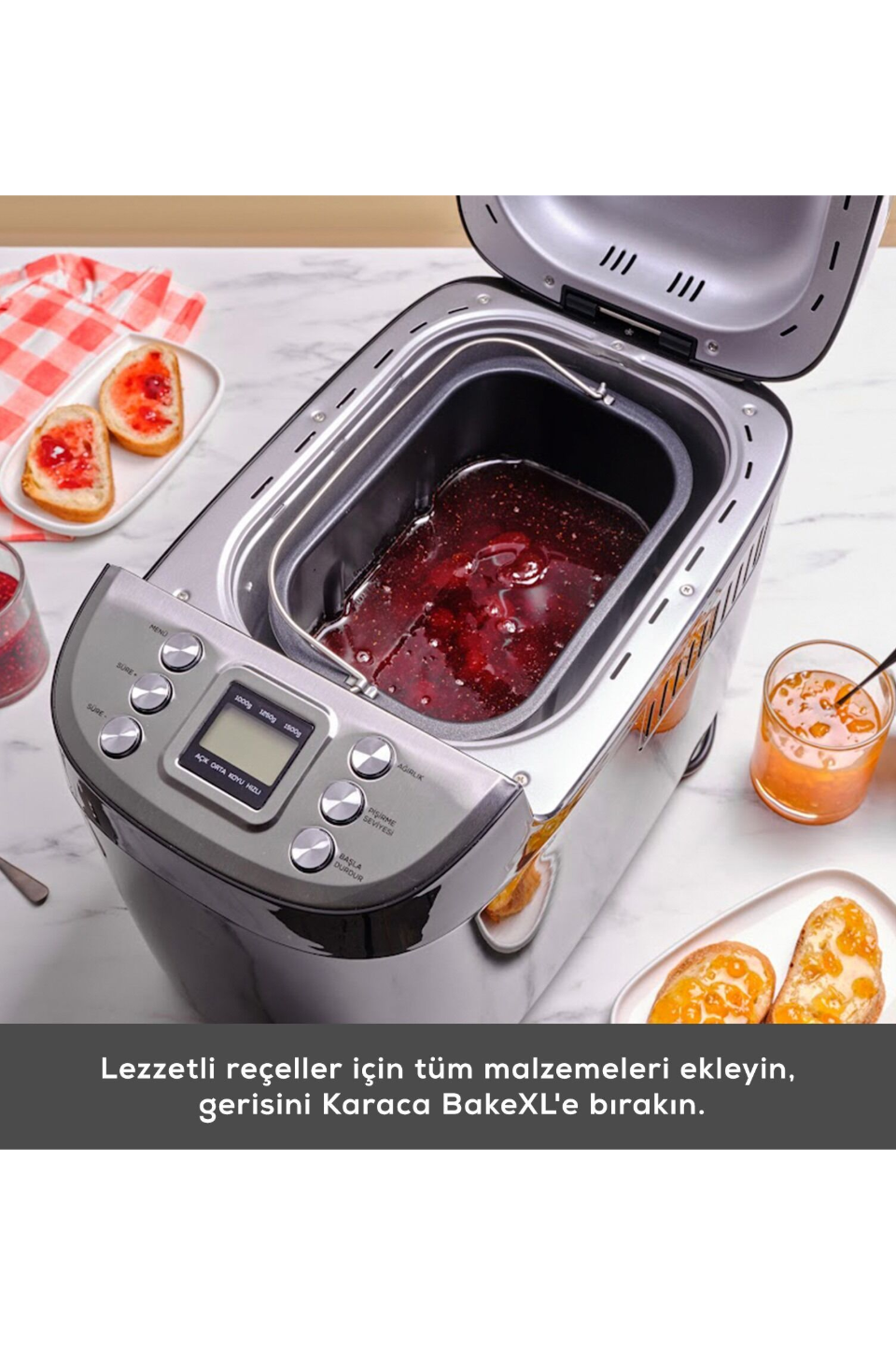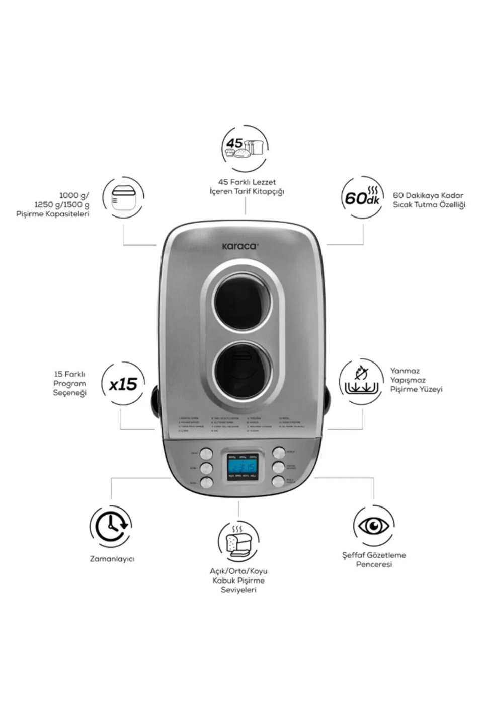 - 15 otomatik program sayesinde dilediğiniz çeşitte ekmekler pişirmenin yanı sıra, kek ve çörekler pişirip yoğurt mayalayabilir, reçel hazırlayabilir ve aynı zamanda dilediğiniz hamuru makinenizde yoğurabilirsiniz.