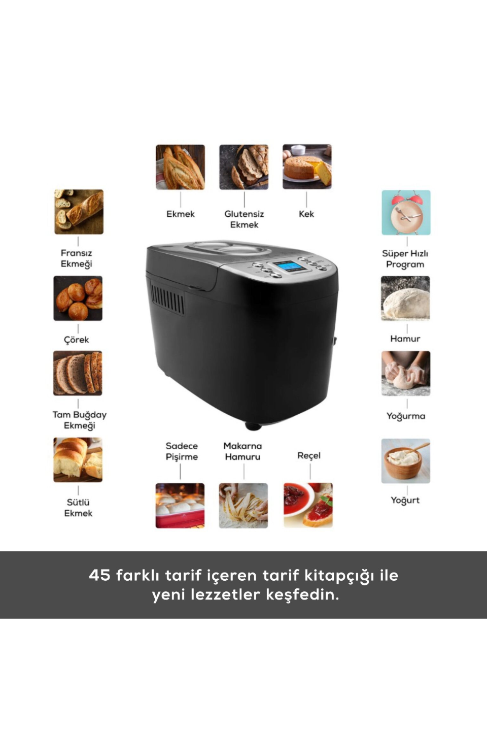 - 45 farklı tarif içeren tarif kitapçığı ile makinenizi kullanmayı daha keyifli hale getirebilirsiniz.