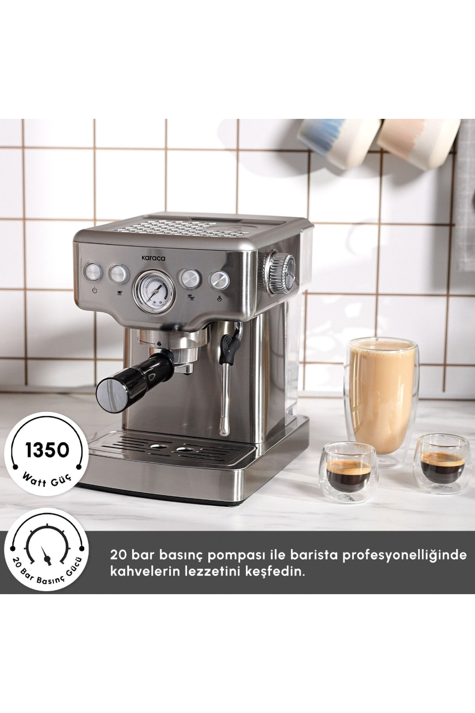 Karaca Coffee Art 1353 Süt Köpürtücülü, 20 Bar Basınçlı, Espresso, Latte, Cappuccino, Americano Makinesi Inox 1,8L 1350W