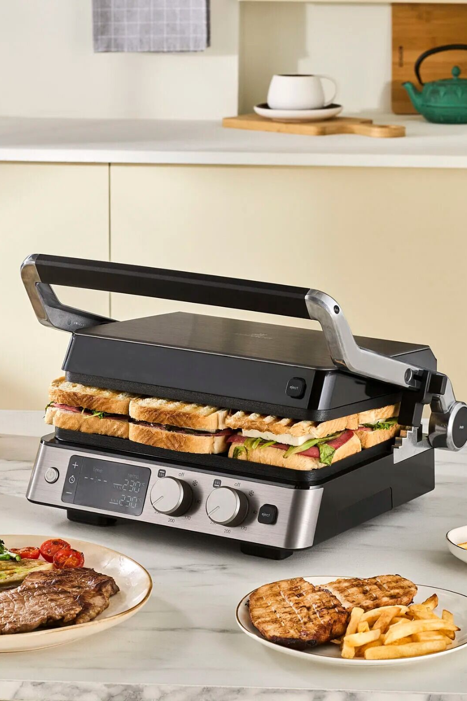 - 3in1 çok amaçlı kullanımı sayesinde 6 adet tostu tek sferde hazırlayabilir, 230 derece sıcakta mühürleme özelliği ile lezzetli ızgaralar pişirebilir ve 180 derece açılma özelliği ile barbekü keyfi yapabilirsiniz.
