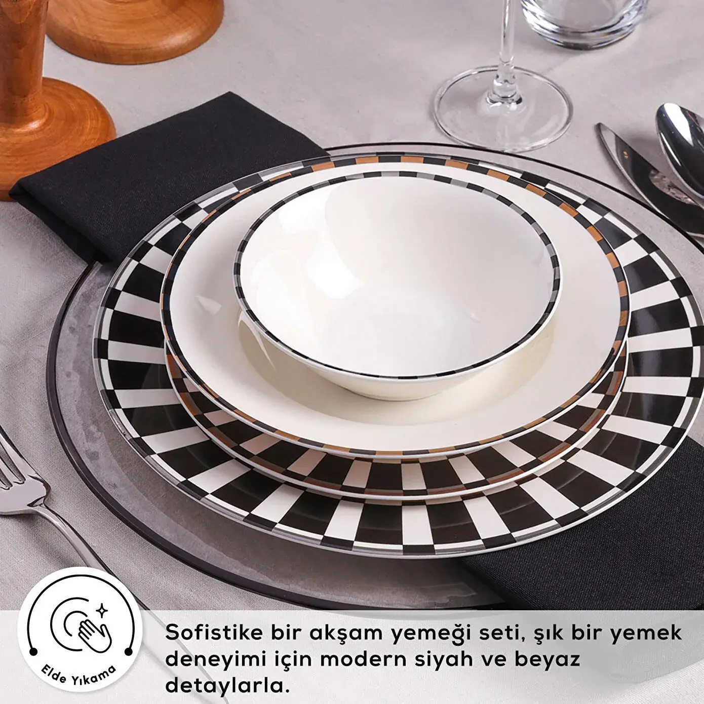 Kemik tozu içeren porselen yapısı sayesinde son derece hafif, aynı zamanda uzun ömürlü ve dayanıklıdır. Hem günlük kullanıma hem de özel davet sofralarına uyum sağlayan bu seri, zarif tasarımı kadar pratikliğiyle de fark yaratır.