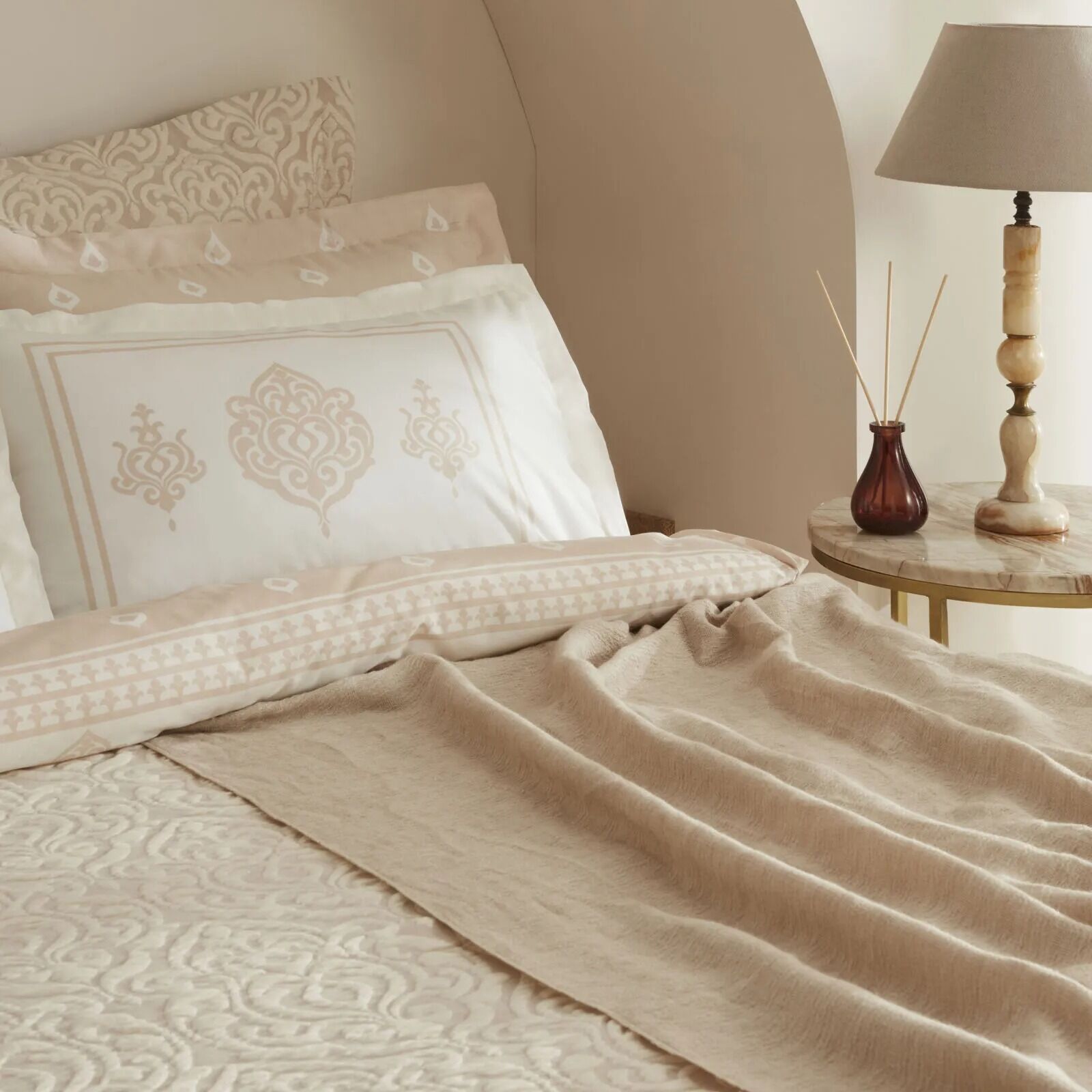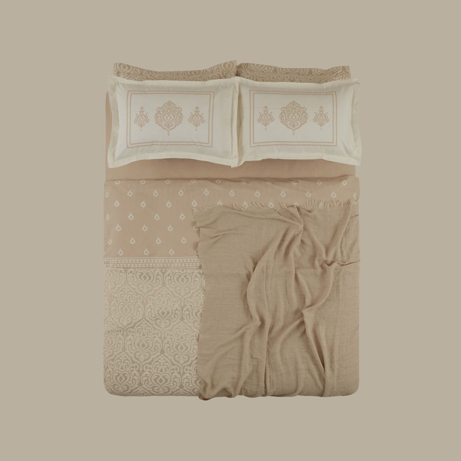Malzeme: 52 tel baskılı nevresim takımı, polyester yatak örtüsü, akrilik battaniye