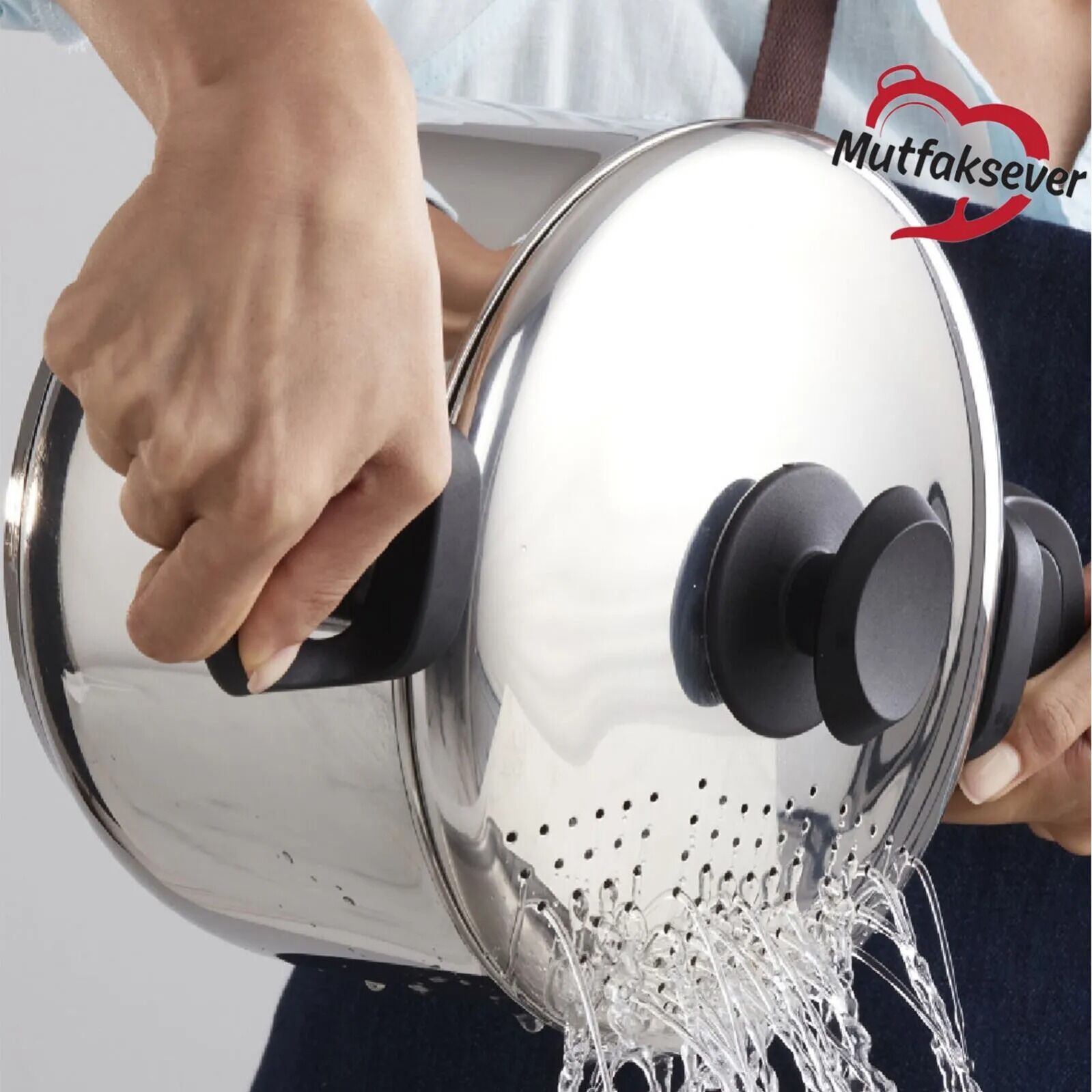 - Kilitli ve süzgeçli kapağı sayesinde süzme işlemini tek hamlede gerçekleştirir.