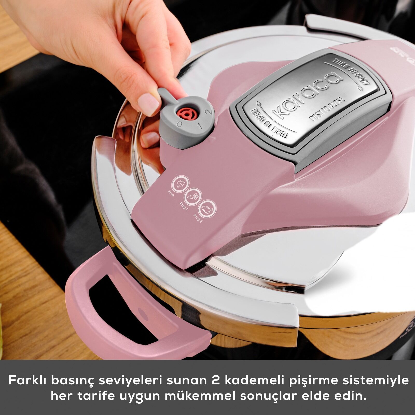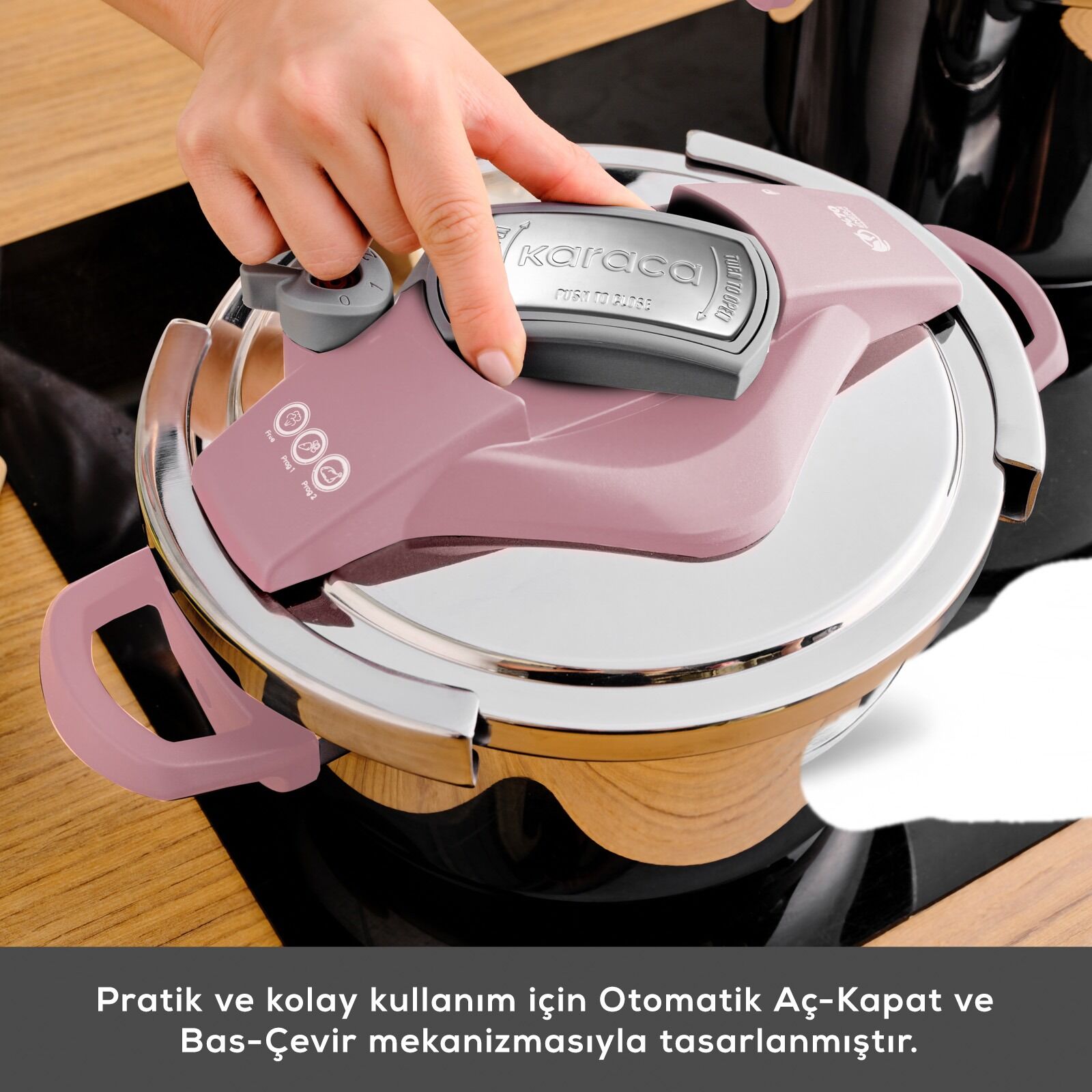 - Düdüklü kapağı ortadaki tuşa basılıp, çevirilerek açılıyor.