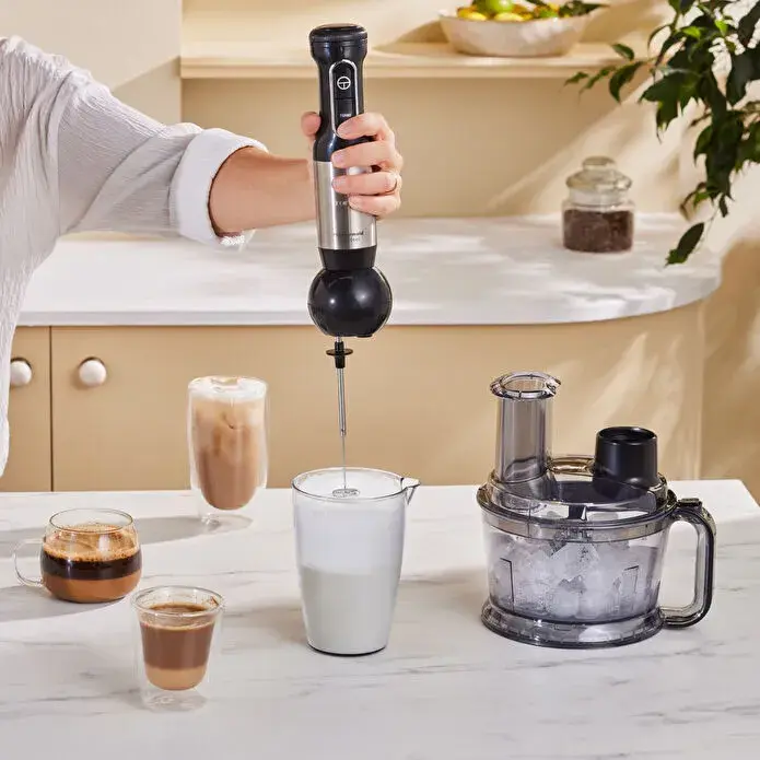 Çırpıcı aparatı ile kek, krema, yumurta gibi karışımları ideal kıvamda çırpabilir, hayalinizdeki kekler ve pastaları yapabilirsiniz. Paslanmaz çelik süt köpürtücü aparatı ise kahve, süt, krema gibi içecekleriniz için harika bir çözüm sunar. Ayrıca, buz ve sert gıdaları rahatlıkla parçalayabilen paslanmaz çelik blender ayağı ile her seferinde homojen sonuçlar elde edersiniz.
