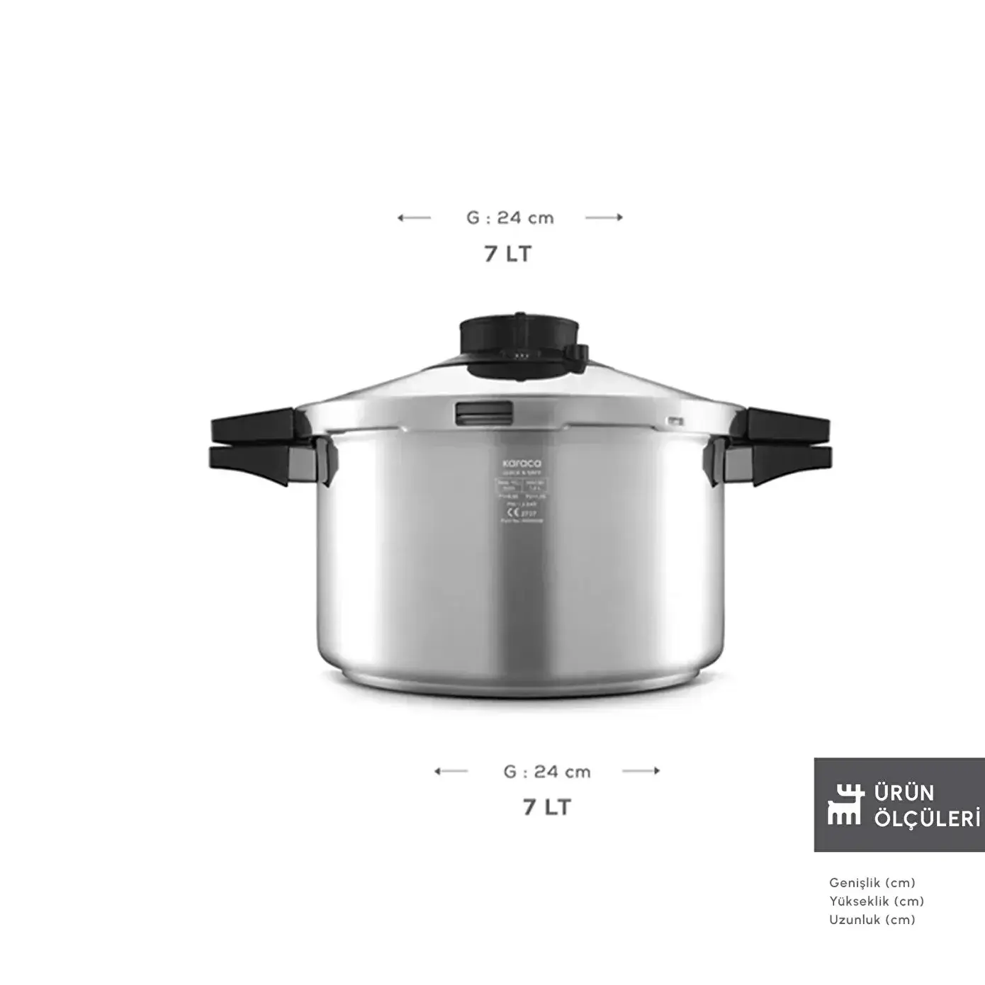 Karaca Quick & Safe düdüklü tencere, 7 litrelik geniş hacmiyle aile yemeklerinizi pratik ve lezzetli hale getirir. Sağlam paslanmaz çelik yapısı ve gelişmiş güvenlik sistemleriyle hem dayanıklı hem de kullanıcı dostudur.