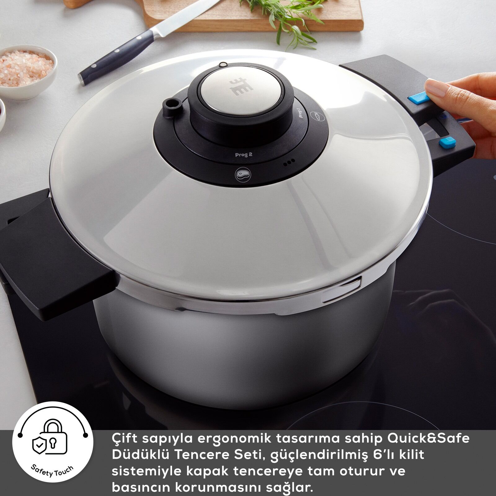 6 ve 4 litre olarak iki ayrı tencereye sahip olan Quick&Safe Düdüklü Tencere Seti, uyumlu çift kapağa sahiptir.