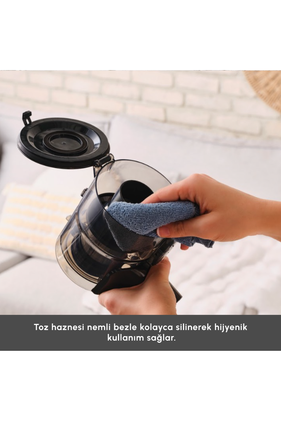 - 0,6 litrelik kolay çıkarılıp takılabilen toz haznesi tek tuşla etrafa toz dağılmadan daha hijyenik bir şekilde boşaltılabilir.