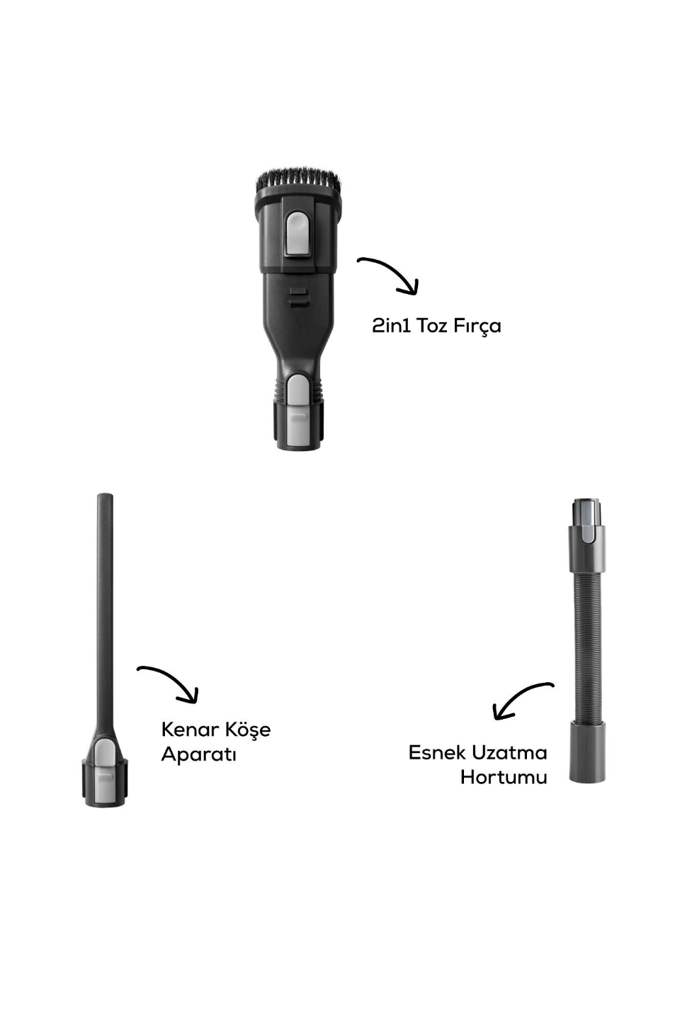- 2’ si bir arada toz fırçası ve kenar köşe aparatıyla uyumlu esnek uzatma hortumu, evinizdeki veya aracınızdaki dar alanların temizliğini kolay hale getirir.