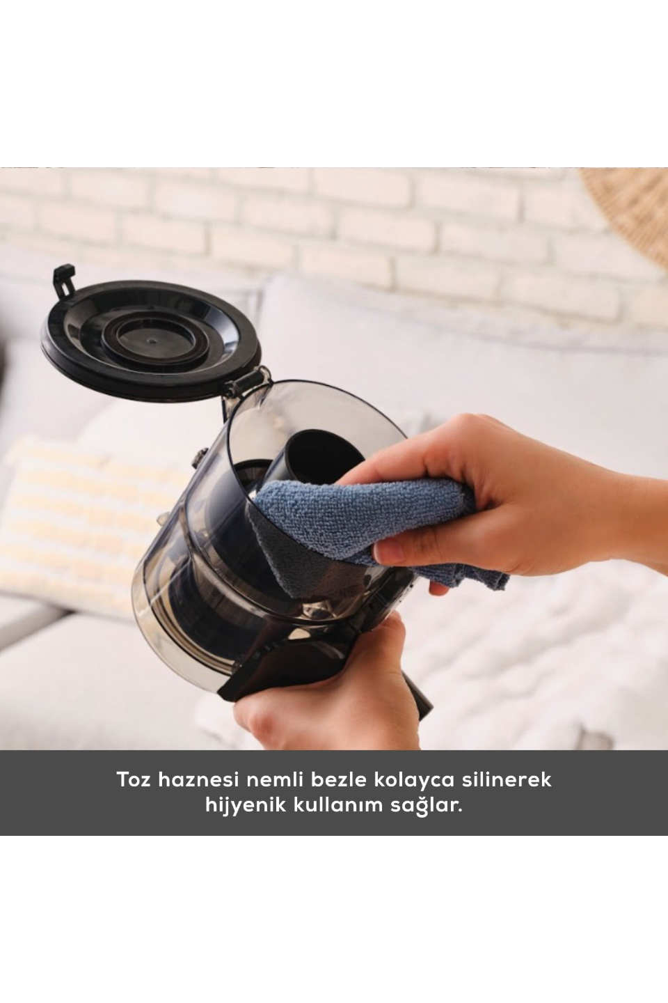 - 0,6 litrelik kolay çıkarılıp takılabilen toz haznesi tek tuşla etrafa toz dağılmadan daha hijyenik bir şekilde boşaltılabilir.